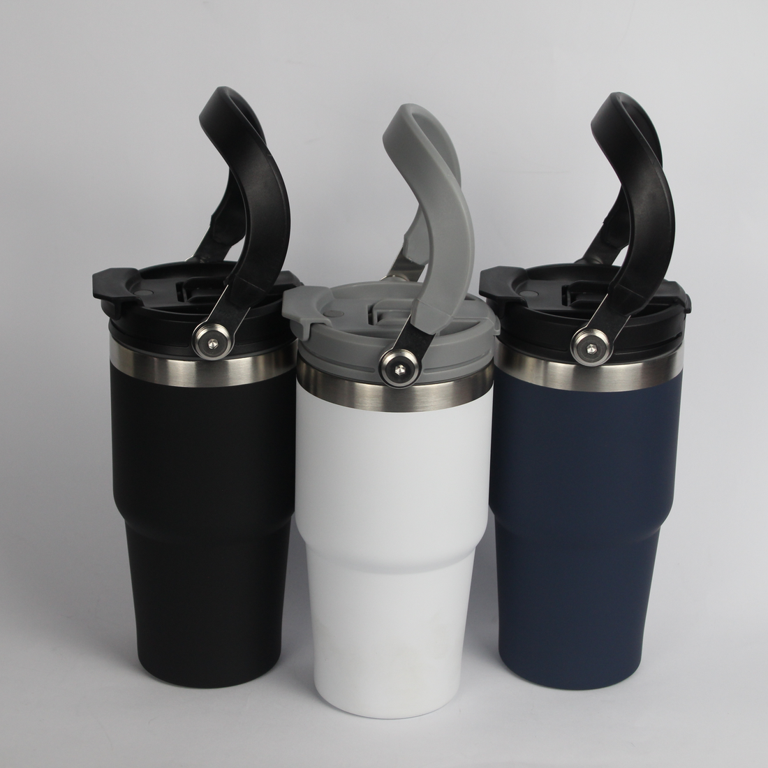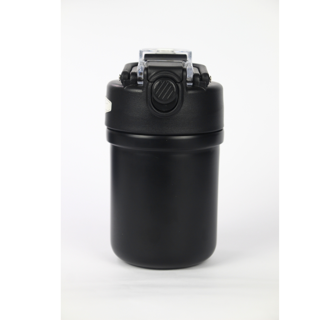 Sleek black travel mug with a matte finish and stainless steel rim for a modern...