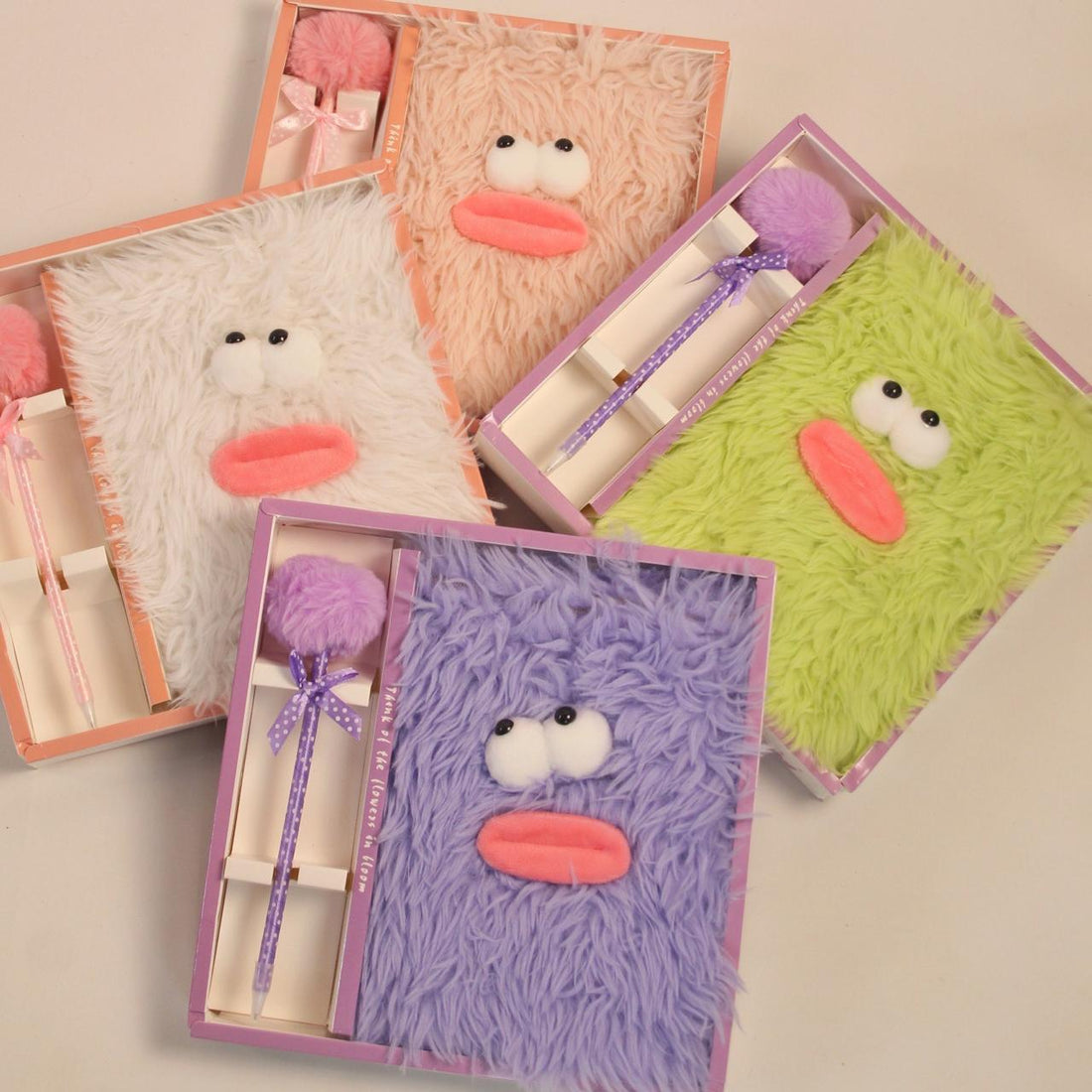 A cheerful and colorful notebook set designed with a fluffy fur cover and a smiling...