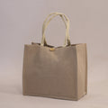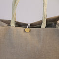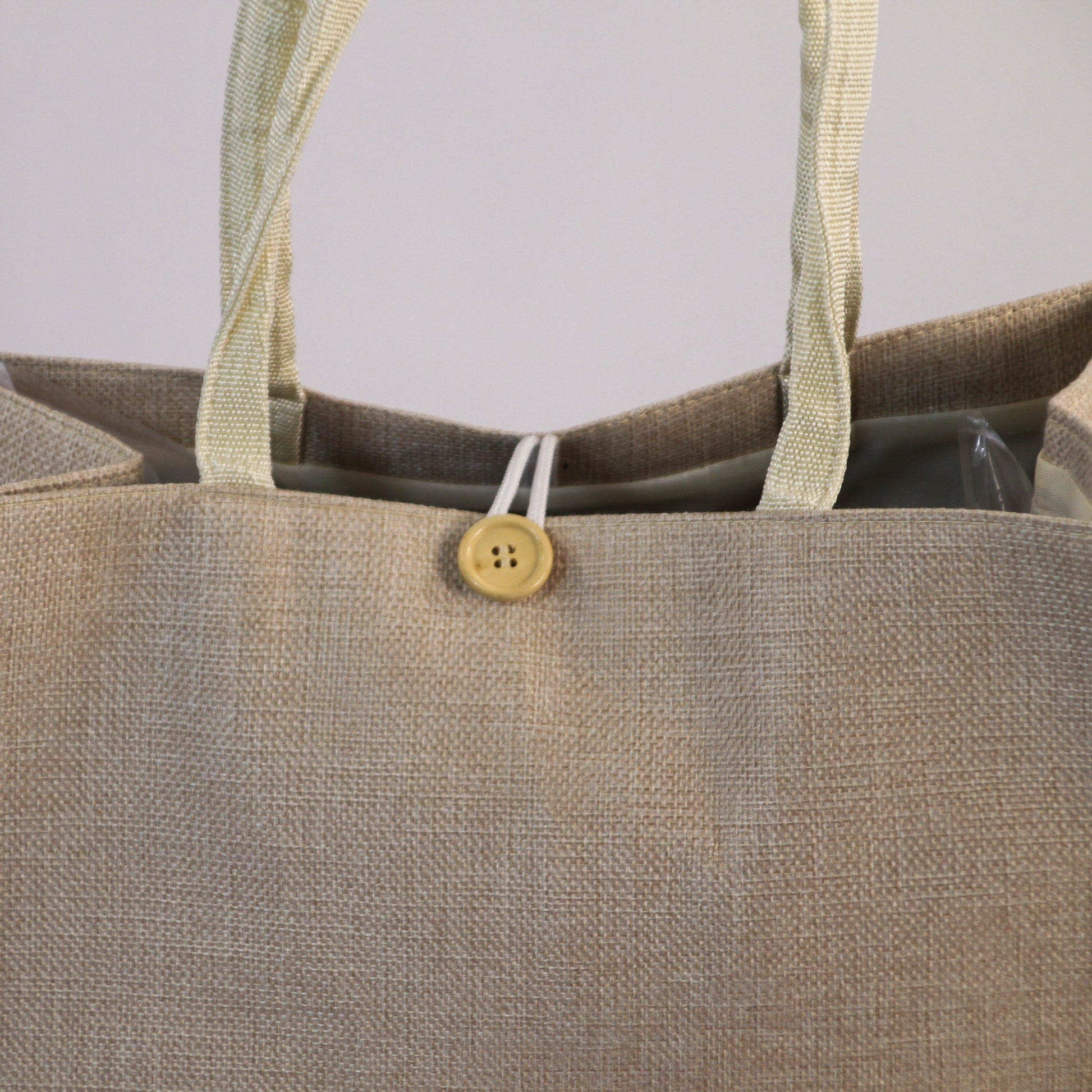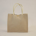This is a stylish beige fabric handbag designed with a clean, rectangular shape and a wide, spacious interior that makes it perfect for carrying everyday essentials. The bag is made from a high-quality burlap-style fabric ,a slightly rough, natural-textured material that gives it a rustic yet elegant charm. It’s equipped with sturdy, twisted rope handles that provide a comfortable grip and complement the organic look of the fabric. At the top, it features a button closure that keeps your belongings secure while maintaining an elegant, understated aesthetic. Its neutral beige tone makes it easy to match with any outfit , casual or slightly dressed up , making it a practical and chic choice for daily use, shopping, or outings.