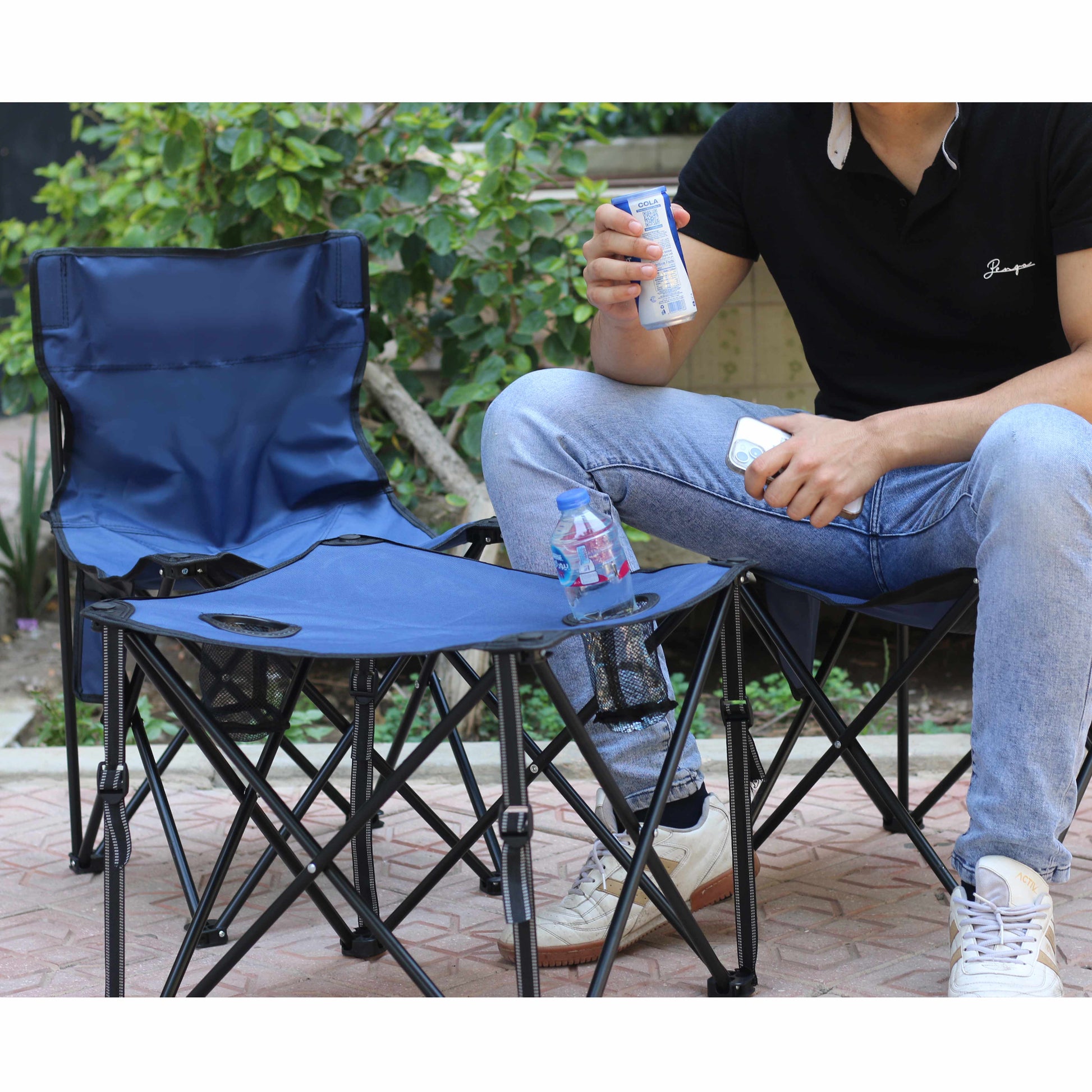 This lightweight and portable camping set is perfect for outdoor adventures. The set includes two folding chairs and a folding table, all with sturdy steel frames and durable polyester fabric. The table features a built-in cooler bag and cup holders for convenience. The set comes with a handy carrying pouch for easy transport.