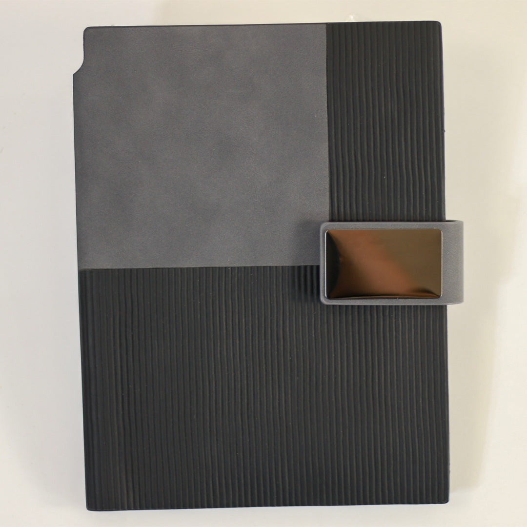 Add a touch of elegance to your workspace with this Black X Grey Notebook featuring a sleek metal clasp design.