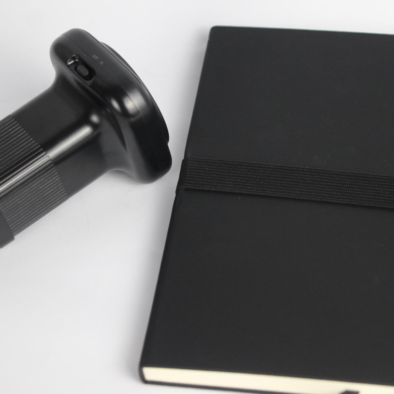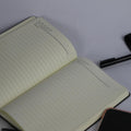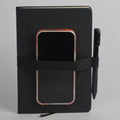 Elevate your workspace with this Black Notebook featuring elegant copper details and a matching black pen.