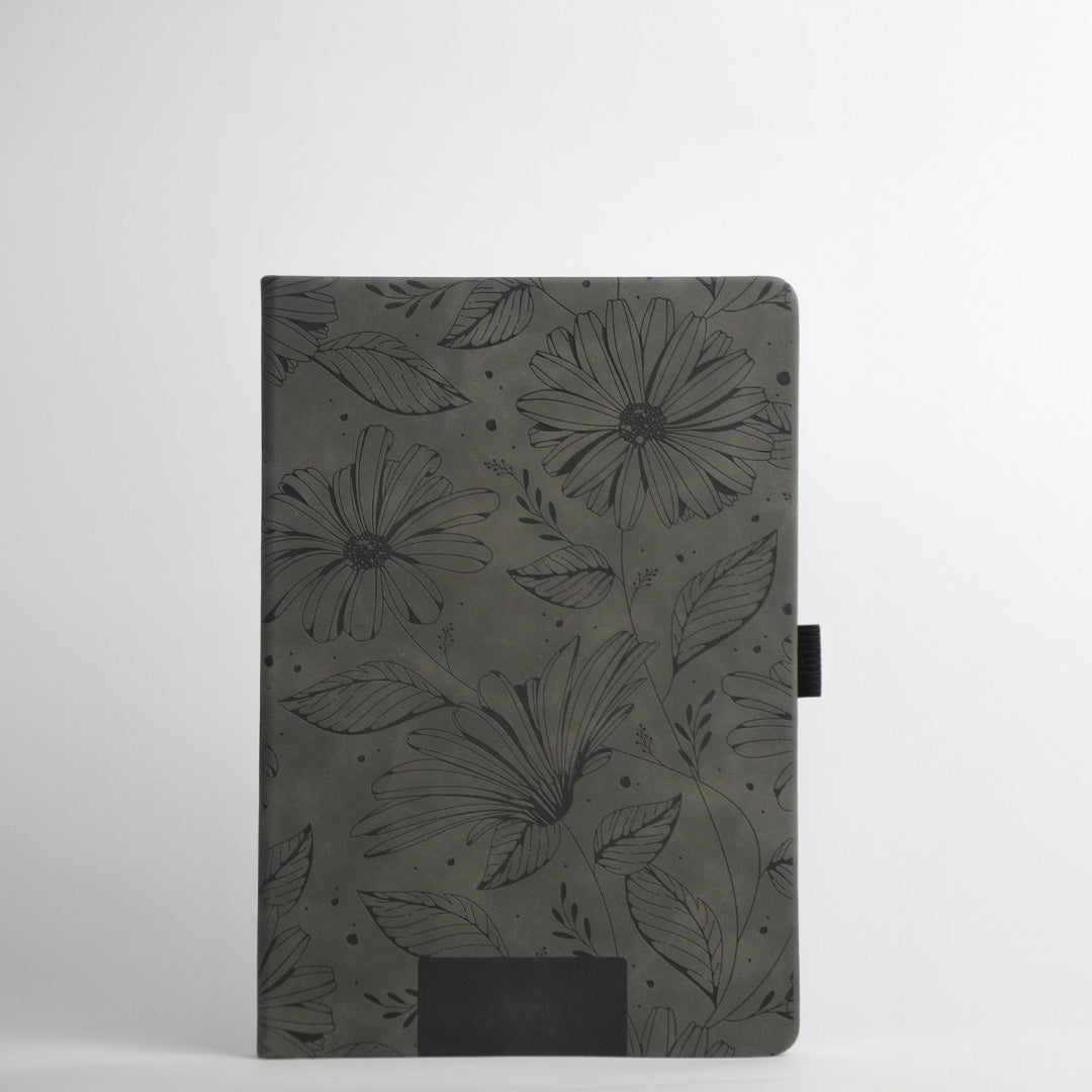 esigned with a soft-touch leather cover delicately engraved with floral patterns, it blends functionality with style.