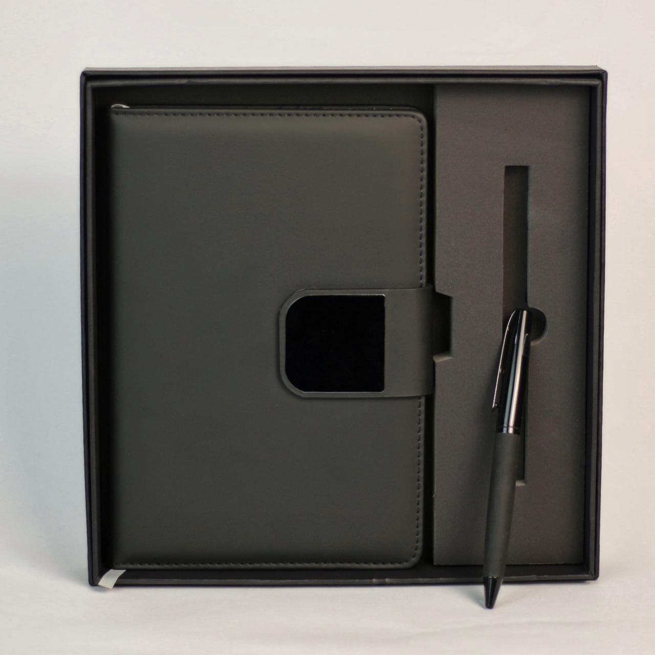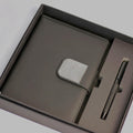 This premium set includes a leather-textured notebook with a magnetic closure for a modern and classy look, along with a matching black pen perfectly placed inside a luxurious gift box.