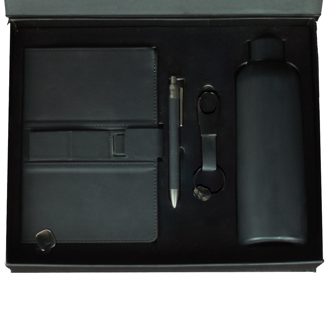 This set has a sleek leather notebook that has mobile holder,refined metal pen, a matte black stainless-steel bottle, and a modern keychain. Perfect for clients, partners, or employees.