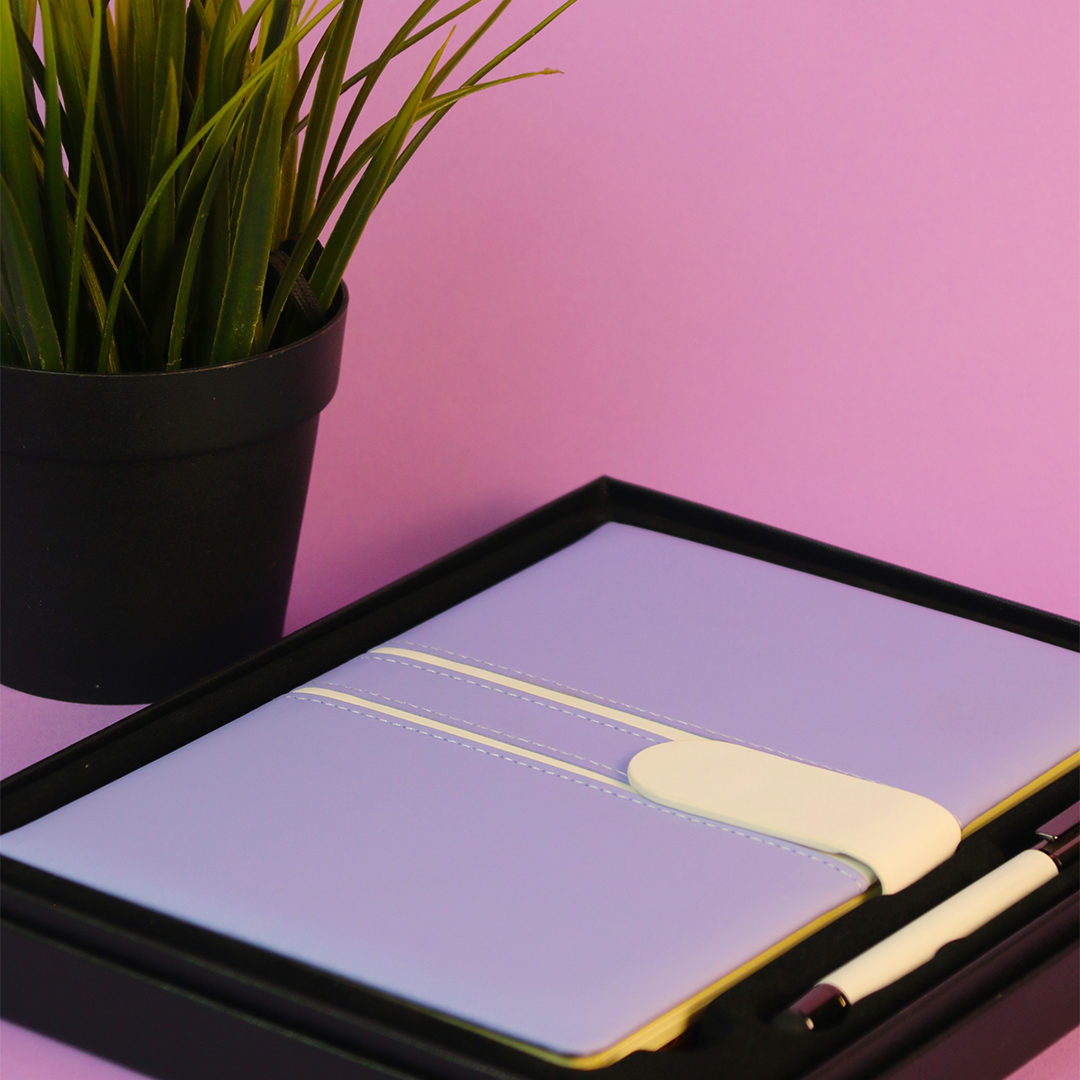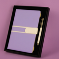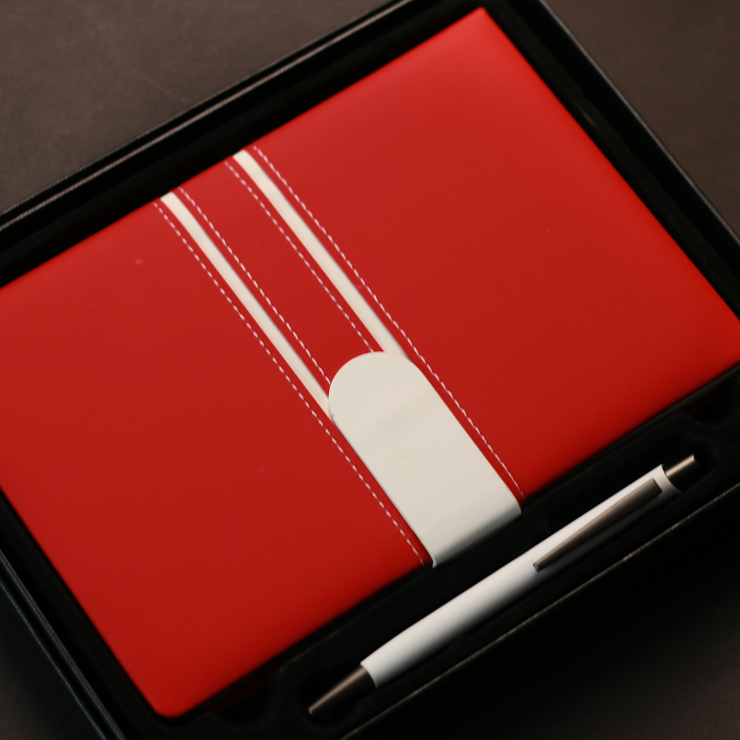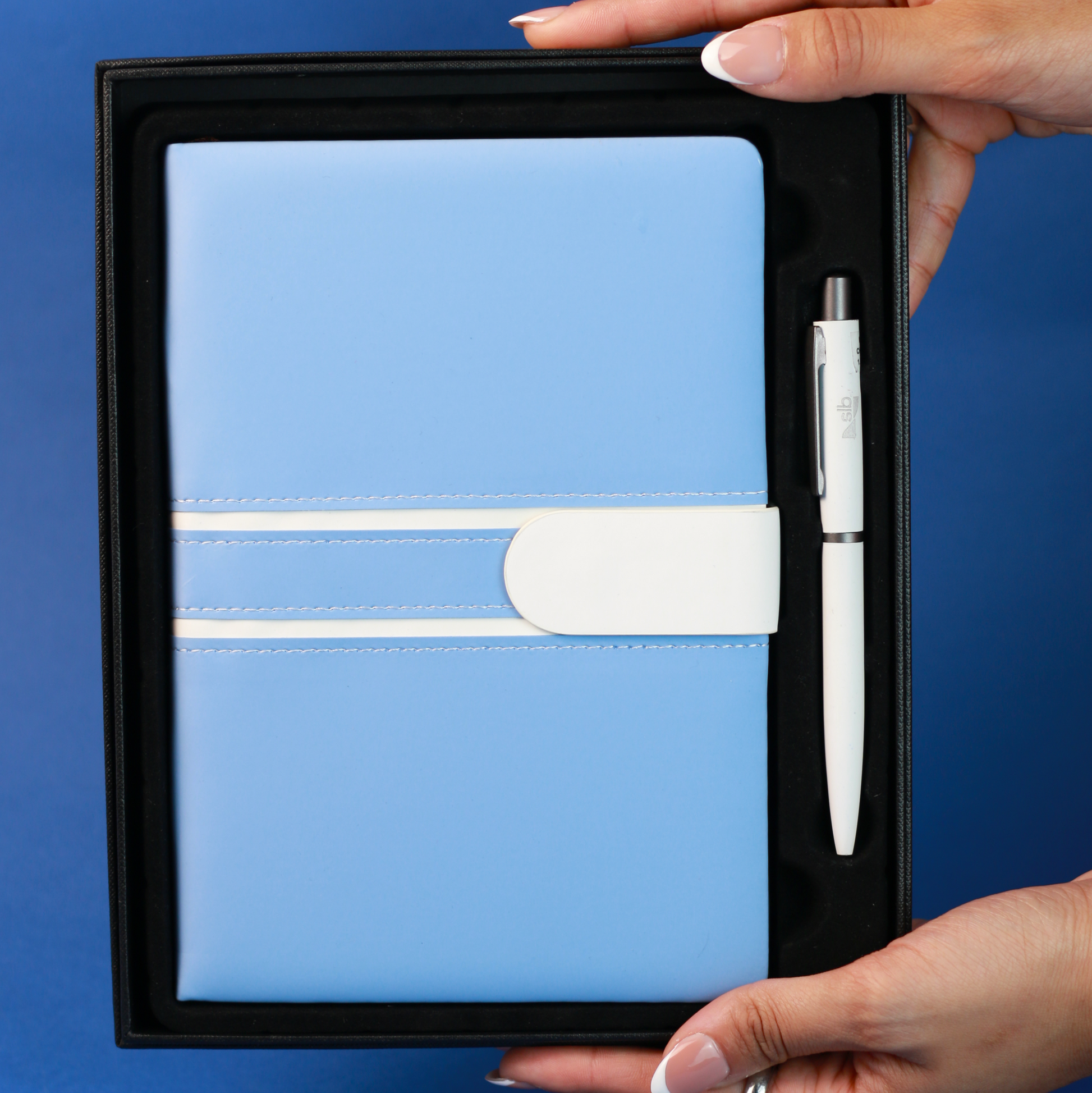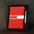 An elegant and practical set that includes a stylish A5 notebook with high-quality cream paper and a sleek metallic pen, all presented in a premium gift box.