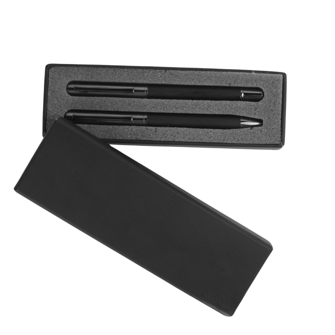 Elegant black pen set featuring a sleek metal finish and minimalist design. Includes a ballpoint pen and a roller pen ,perfect for daily use or as a sophisticated gift. Smooth ink flow ensures effortless writing, while the premium look makes it ideal for corporate giveaways or executive desks.
