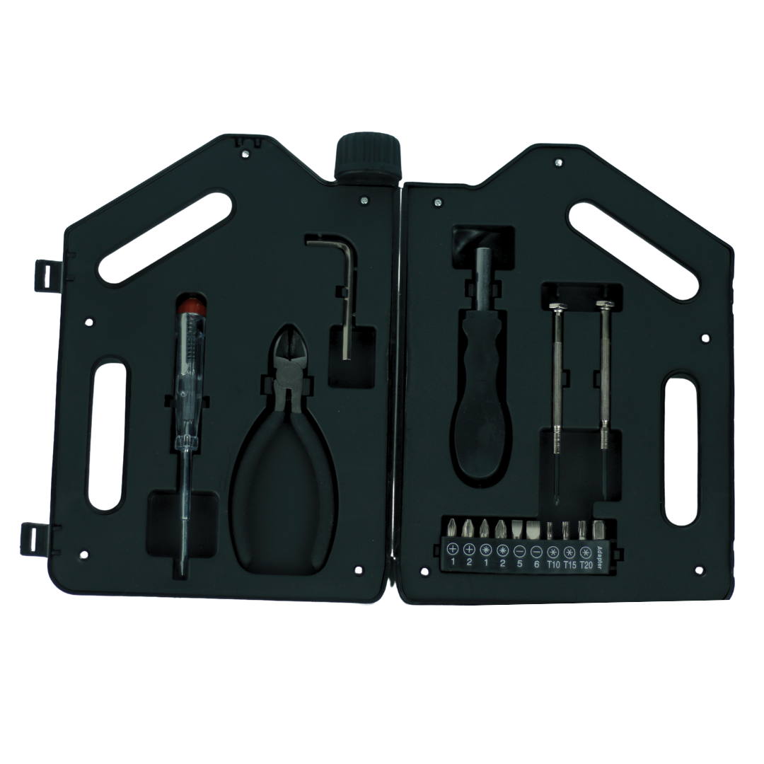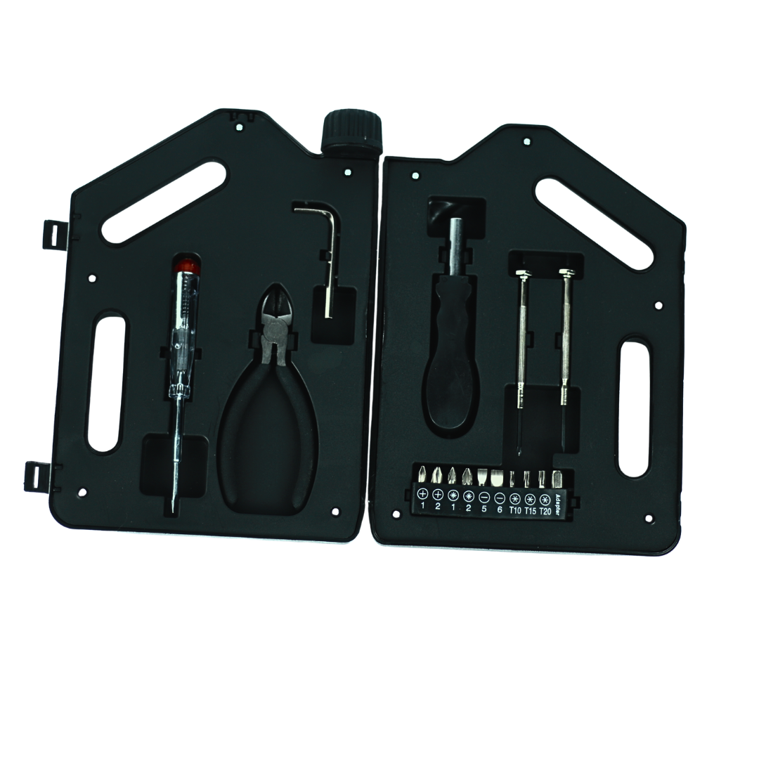This toolkit comes in a unique and sturdy jerrycan-shaped case, combining practicality with a creative design. Inside, you’ll find a complete set of essential tools including a screwdriver, pliers, Allen keys, and multiple interchangeable screw heads perfect for tackling a wide range of repair and maintenance tasks.